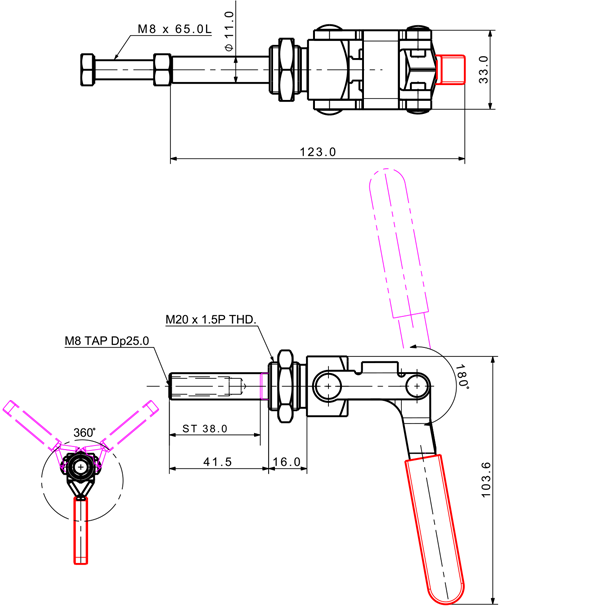 150 299 180˚ M8 x 65.0L 38 Threaded